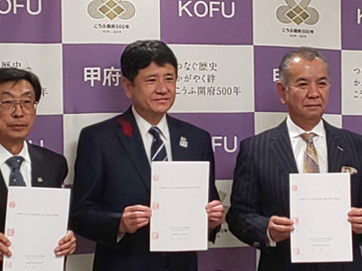 (写真 中央:甲府市長 樋口 雄一 右:(株)宗家日本印相協会 代表取締役社長 久保田 孝)